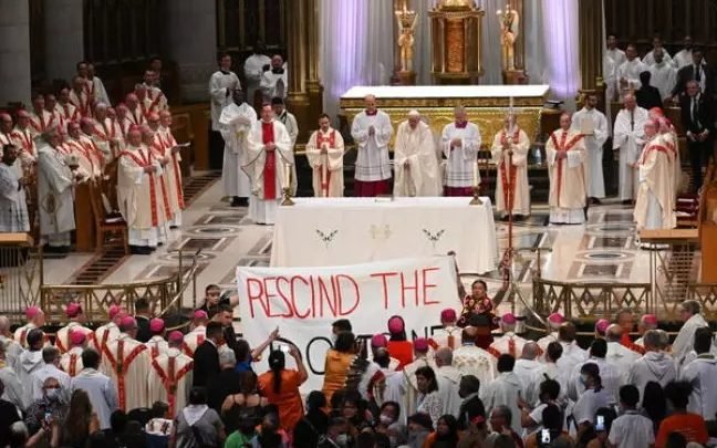 Um grupo de indígenas estendeu diante do altar uma faixa com os dizeres “Rescind the doctrine” (“Revogue a doutrina”, em tradução livre), mas foi rapidamente afastado pelos seguranças.